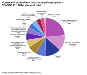 8) Grafikon- Eurostat. (2025). Household expenditure by consumption purpose – COICOP 2018, EU, 2024, share of the total. In Household consumption by purpose. Eurostat. https://ec.europa.eu/eurostat/statistics-explained/SEPDF/cache/49480.pdf